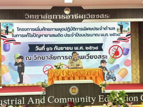 วันที่ 16 กันยายน 2568 เวลา 08.00 – 16.30 น. ณ ห้องประชุมชั้น 2 อาคารโกมลคีมทอง วิทยาลัยการอาชีพเวียงสระ อำเภอเวียงสระ จังหวัดสุราษฎร์ธานี ได้มีพิธีเปิดการอบรม โครงการเพิ่มศักยภาพชุดปฏิบัติการพิเศษประจำตำบลในการแก้ไขปัญหายาเสพติด ประจำปีงบประมาณ พ.ศ. 2568